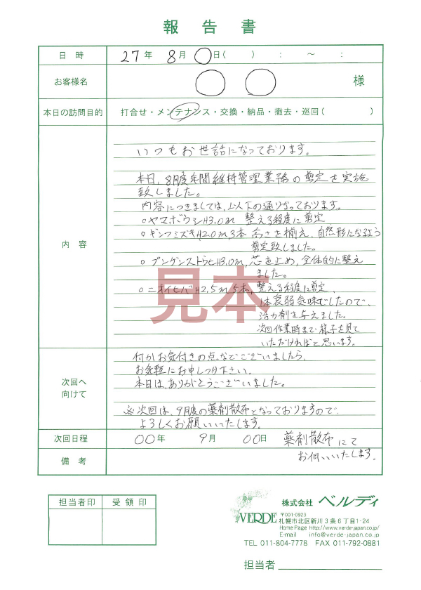 いつでも綺麗で素敵な庭にしたいと思っても、維持活動=メンテナンスをしっかりとしていなければ、理想としている庭も維持できなくなってしまいます。そこで、ベルディでは年間を通したメンテナンス業務を一括で承っております。また、トータルでのプロデュースを行っているため、お客様がご自身でできるメンテナンス、当社へ発注するメンテナンスを選ぶ事も可能です。弊社がメンテナンスを行った際には、お客様へメンテナンスについての報告書を提出させていただいております。