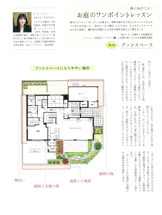 弊社代表の関本の記事が花新聞に掲載されました。今回はお庭のデッドスペース問題について、誰でも簡単に改善できる方法や、植物の選び方、便利アイテムを紹介しております。お庭作りをもっと楽しく、もっと快適にする為に、ぜひこの記事をお役立て下さい。※画像をクリックすると大きい画面になります。