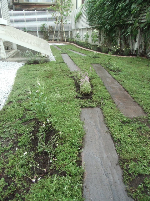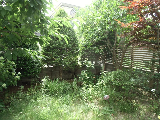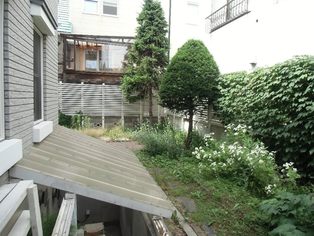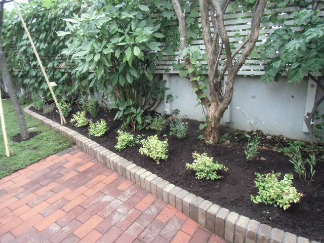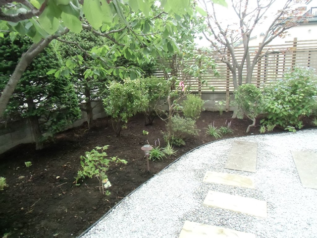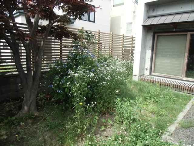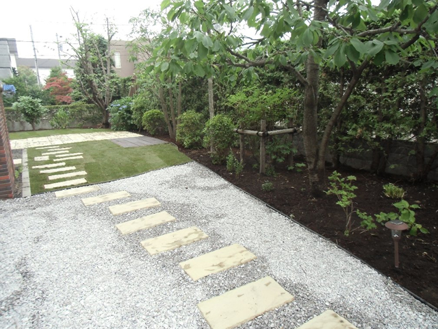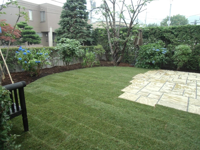 大きくなりすぎた樹木を伐採し、整え、収拾のつかない程育ってしまった雑草と宿根草は全て刈り取りました。凸凹のあった地面をレンガと枕木で平らにし、枕木でアプローチを作りました。和室から見える庭は砂利にし、和風系の樹木を移植し、シュウメイギクやヤブランを植え、さらに札幌軟石を敷き「ウインドウピクチャー」のような構図で仕上げました。