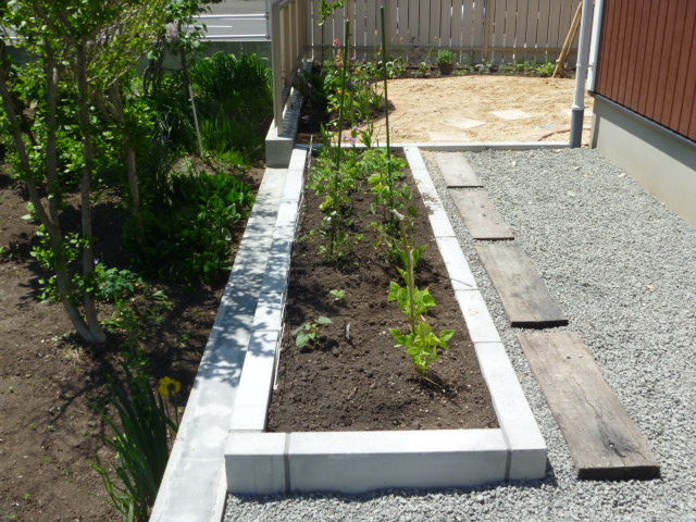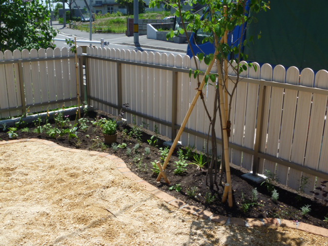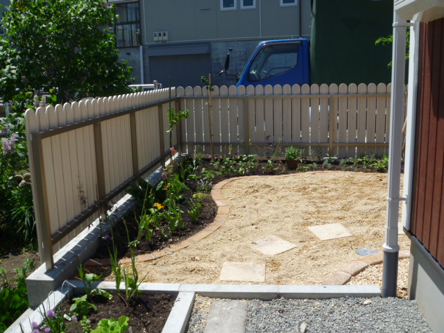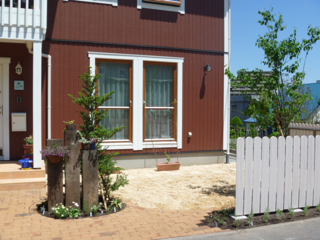 駐車スペースから中庭までの導線に植物を配置し、緑に囲まれた空間を造り上げました。樹木・枕木・フェンスで高低差を出し、仕切りでは曲線を描く事で動きのある庭を演出し、花壇には四季折々を楽しめる花や植物を植え、彩りを加えました。
