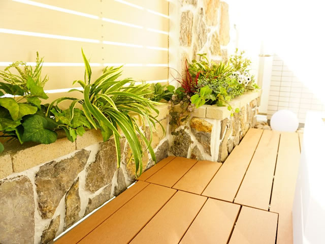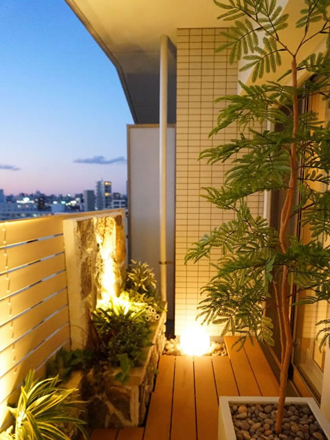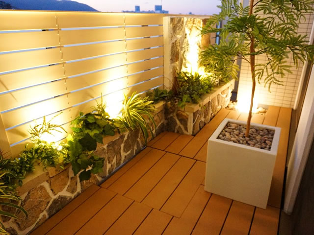 マンションのバルコニーにウッドデッキを設置しました。ウッドデッキ・フェンスは共にメンテナンスフリーの素材を使用しています。また、夜は照明を付けてライトアアップしております。
